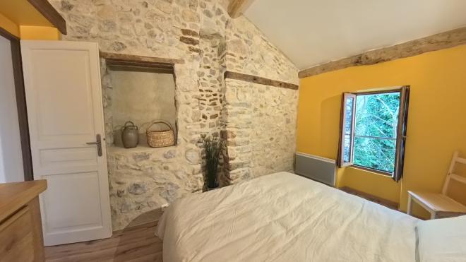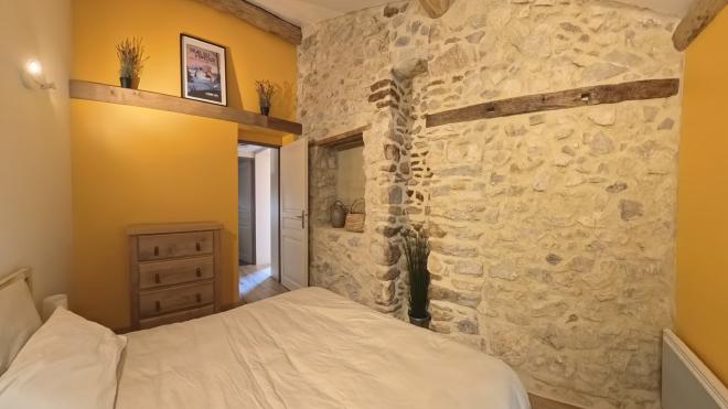 Charmante maison de village en Drôme provençale :tada:/ La maison et ses différentes pièces/ La chambre jaune/ La chambre jaune Photo Pièces Visite Maison Située à l’étage supérieur, la chambre jaune est la chambre principale. Le mur en pierre et les poutres naturelles vous feront dormir en provence. Équippée d’un lit Queen-size (160cm), son charme ne laisse pas indifférent.