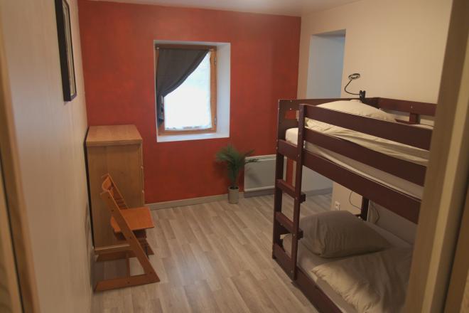 Située à l’étage inférieur, la chambre rouge est la plus petite chambre, dédiée aux enfants avec son lit supperposé.