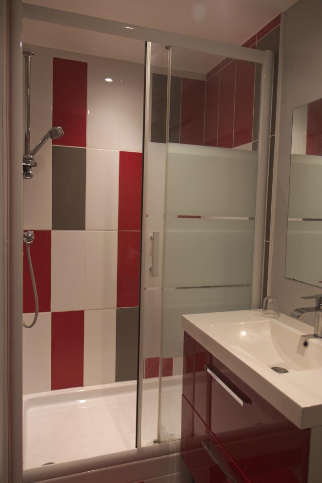 La petite salle de bain du niveau bas est située entre les chambres rouge et verte.